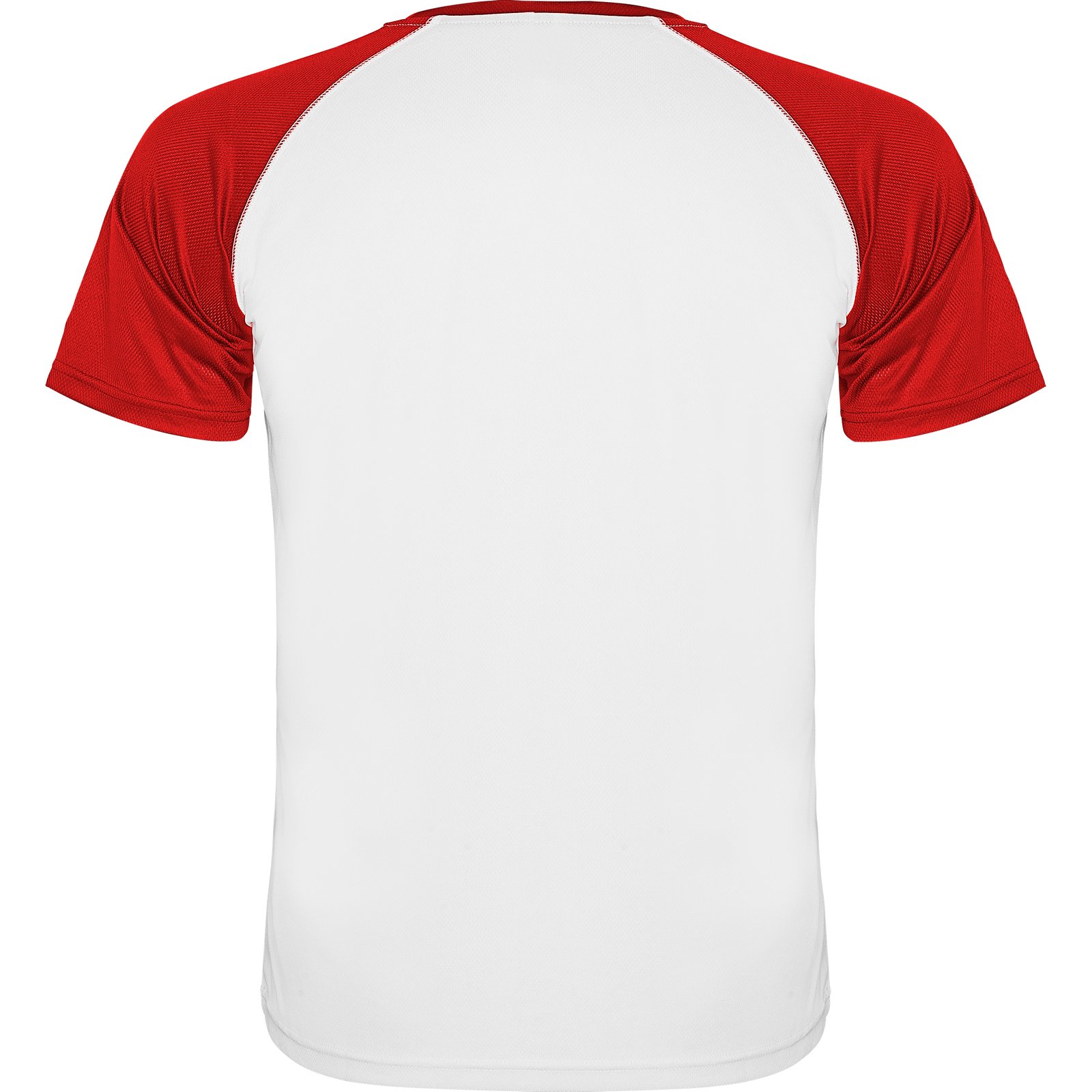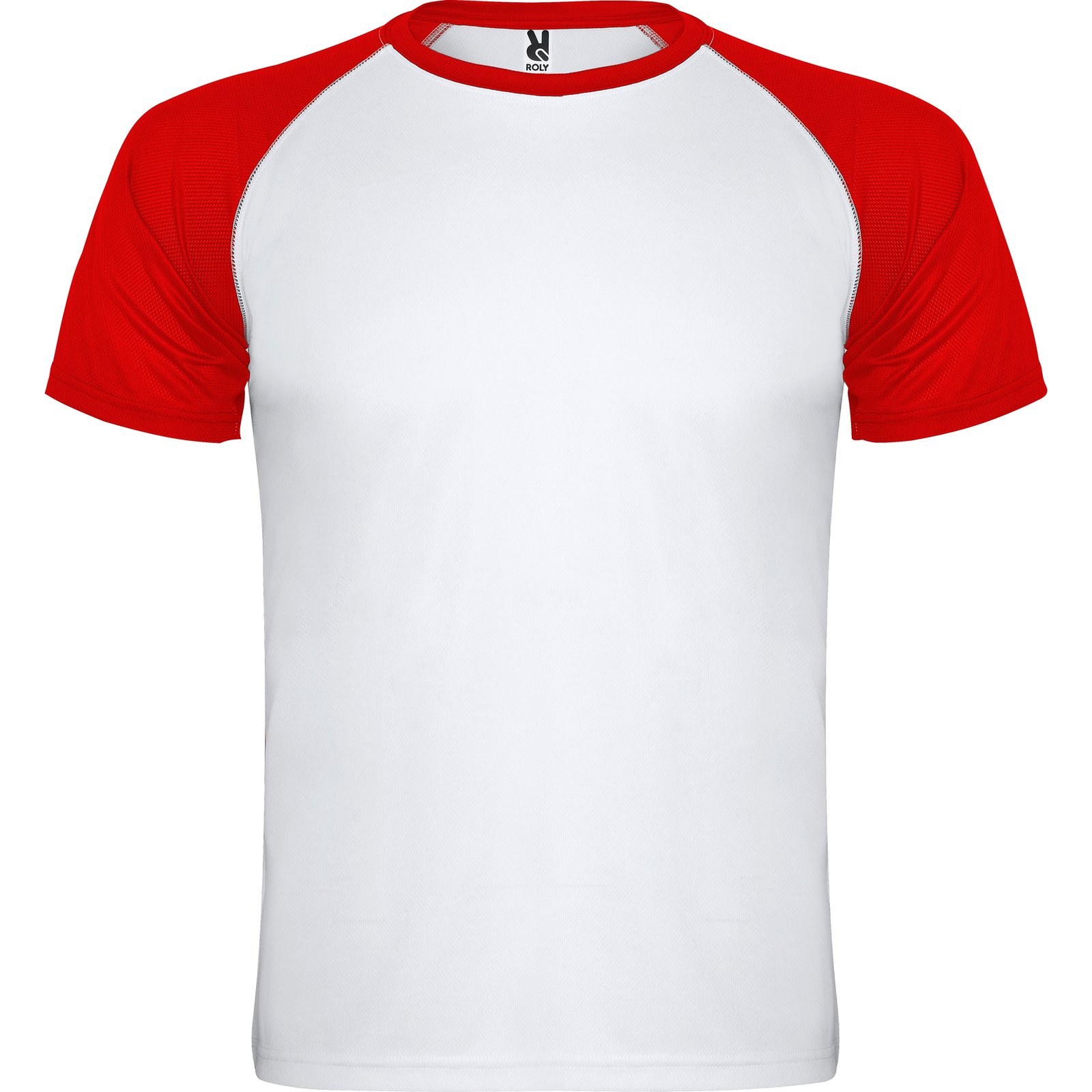 Camiseta deportiva de manga corta estilo ranglan en contraste. Cuello redondo en contraste con cubrecosturas de refuerzo.